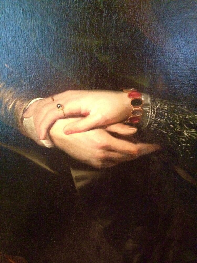 painted meticulously by a highly skilled student. The painting of the couple seated underneath “The Honeysuckle Bower” as the painting is called, is filled with symbolism, including love and marriage, union, aristocracy and bounty.