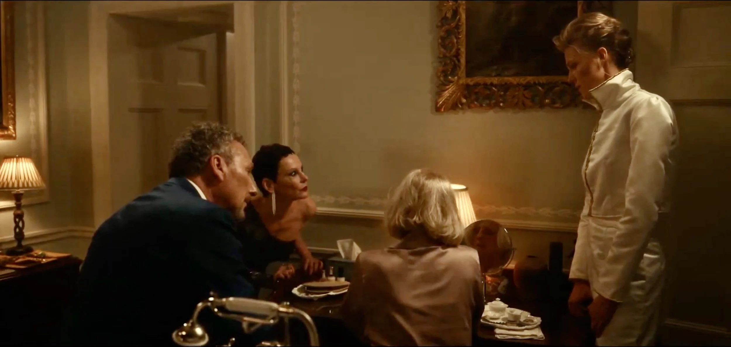 I was not allowed to light the small tea lights in elegant votive candleholders I had placed on the table. This was done for lighting consistency as per our DOP. I regret that I did not push this point more strongly, as I still believe something was lost in not allowing the shimmer of a real flame at the table and on the faces of the characters as is so often used in films.